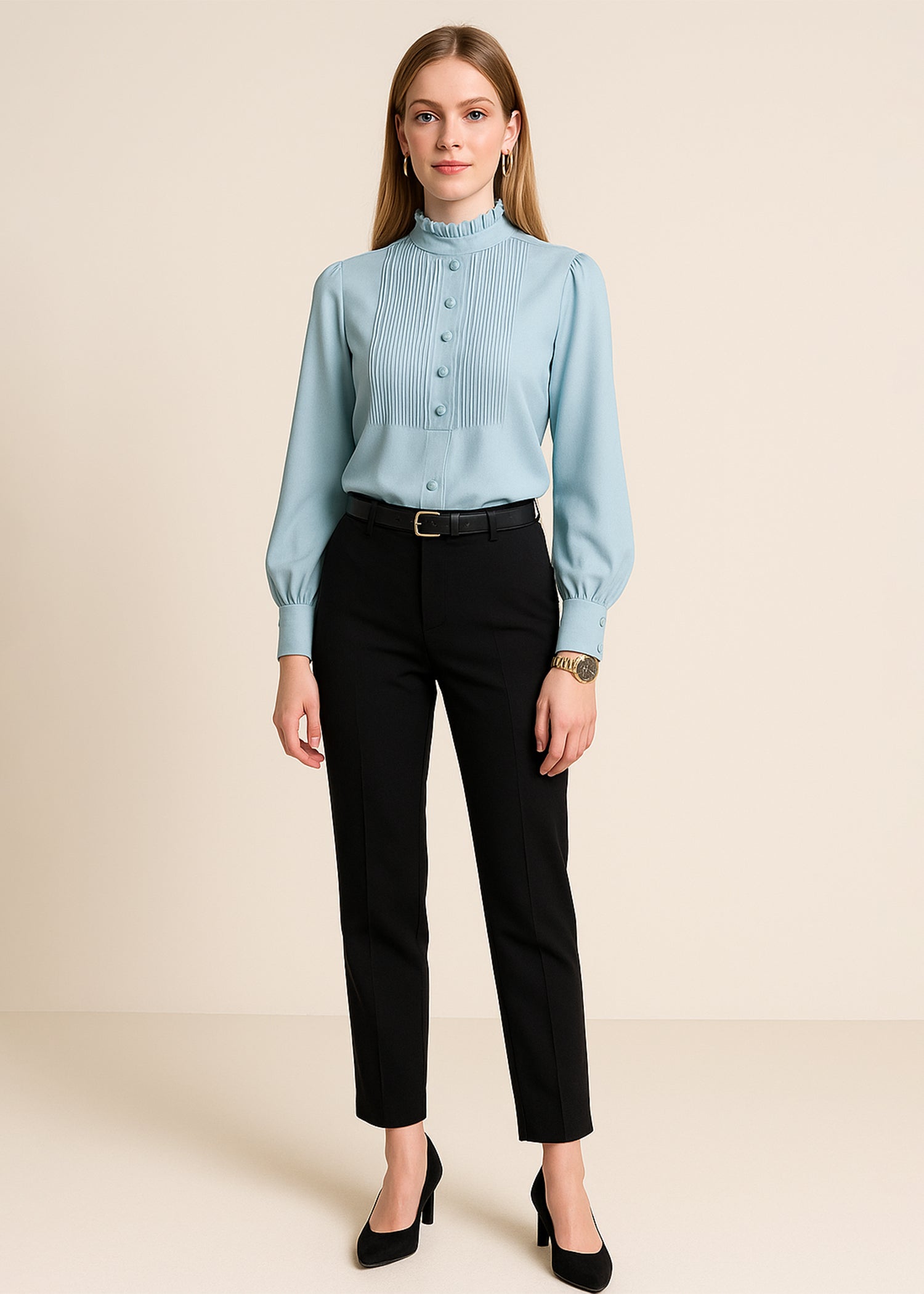Light Blue Ruffle Neckline Blouse for Female