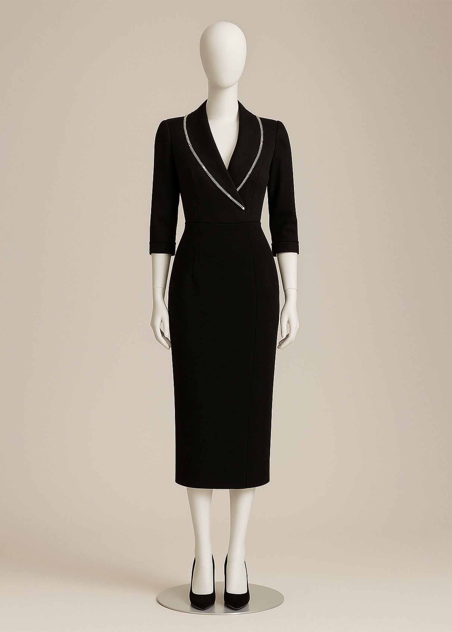 This pearl embellished blazer in black color that redefines boardroom polish. Cut exclusively for the female form, this piece features a plunging V-neckline trimmed in hand-applied pearls—subtle shine, uncompromising strength. The ¾ sleeves balance elegance with efficiency, moving with you from pitch to power lunch.