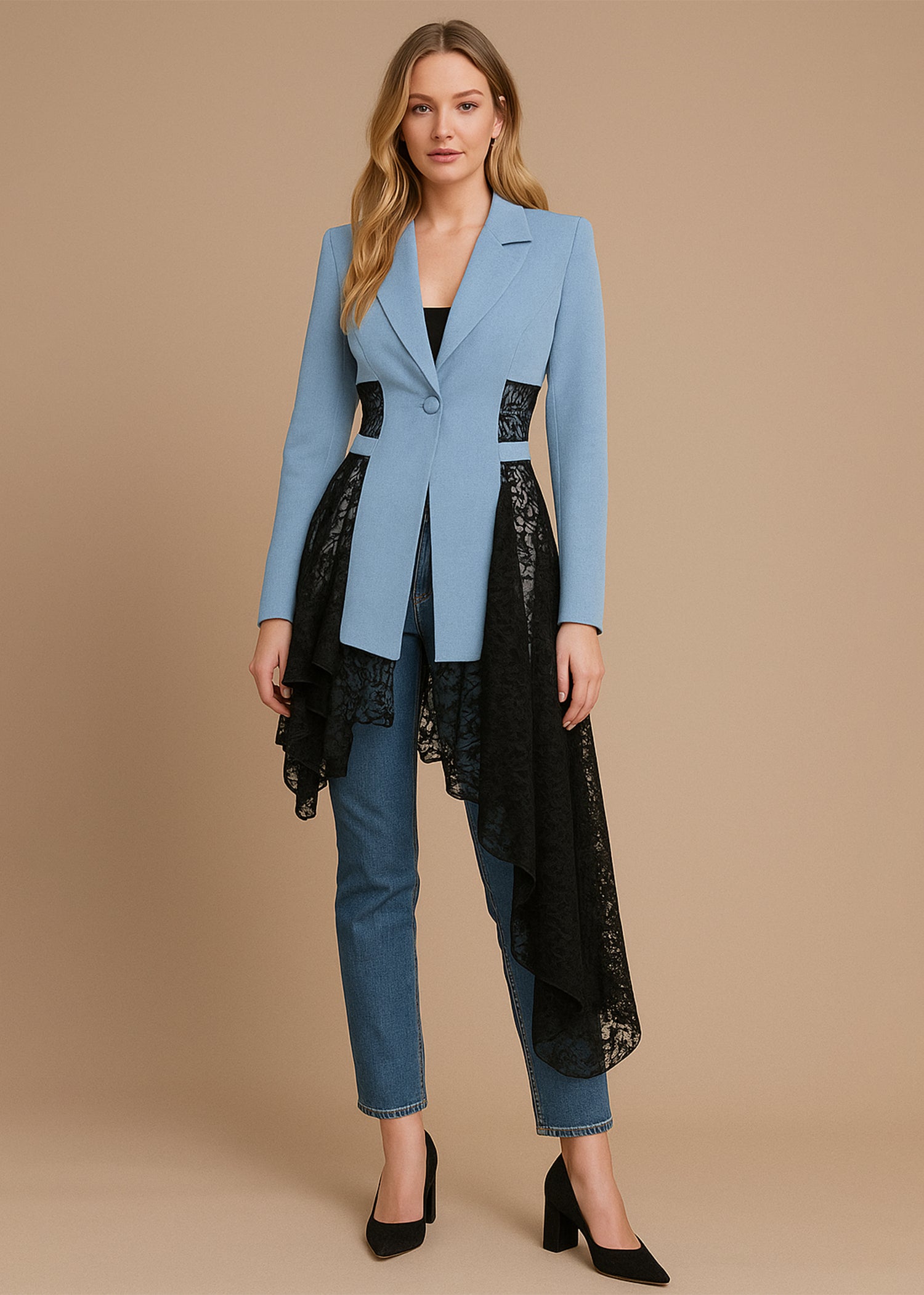 Meet your next conversation starter: a blazer with lace designed for the empowered woman who commands every room. At first glance, it’s a classic—single-breasted, notched lapel, with a crisp cotton finish in serene light blue. But below the waist? A daring reveal. Black lace panels whisper intrigue while still nodding to office-appropriate polish.