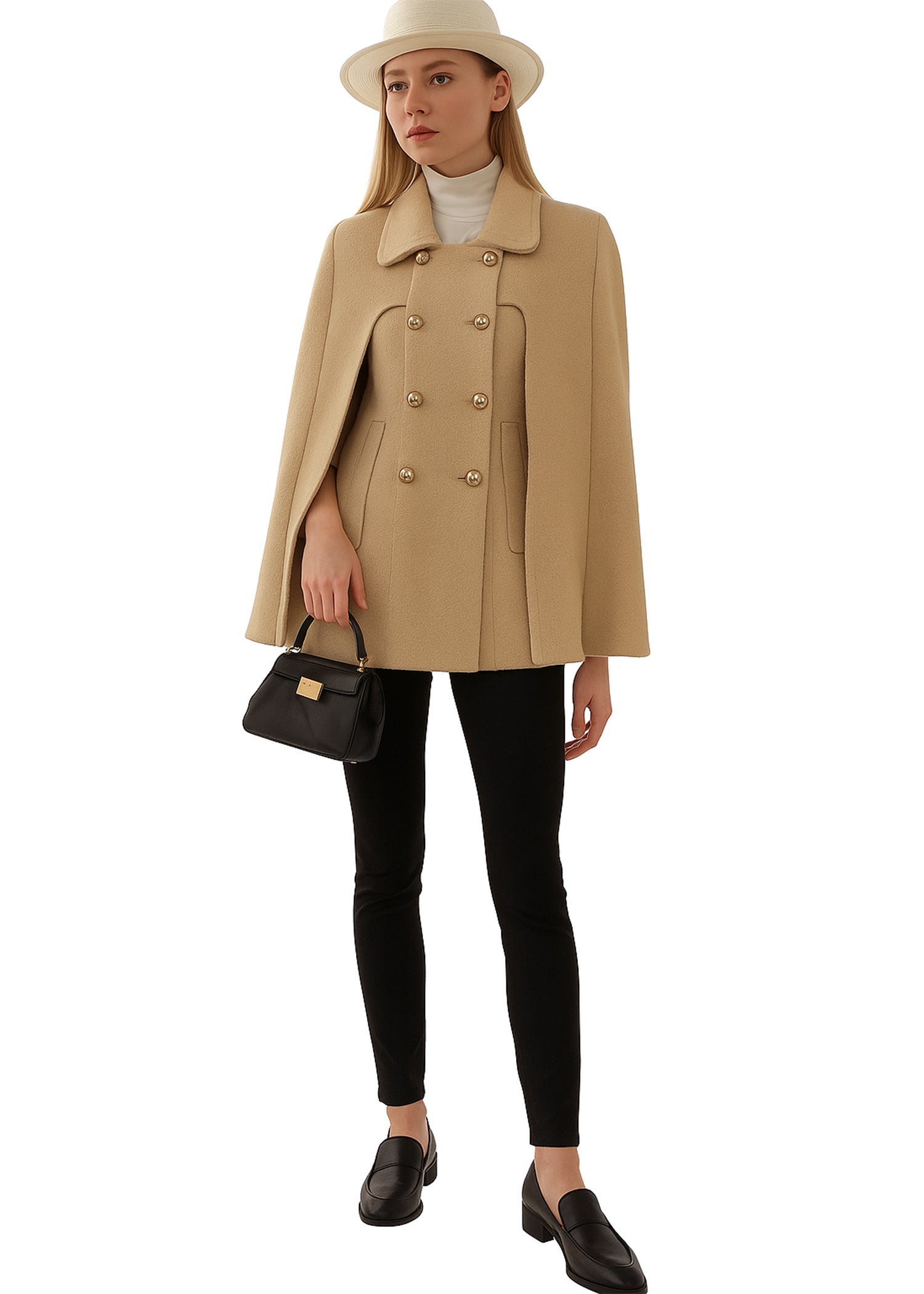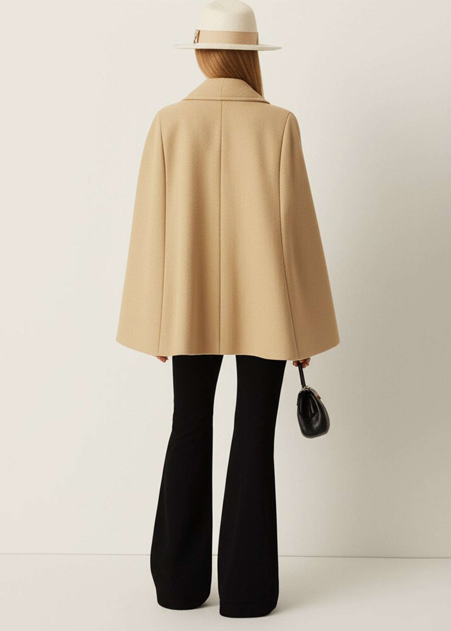 There’s nothing quite like the sweeping grace of a Poncho Cape Coat to reframe your morning commute. Crafted in camel cotton with a flowy silhouette and slit sleeves, this coat drapes effortlessly—offering warmth, movement, and undeniable presence. Double-breasted buttons lend structure, while the lapel collar and flap pockets speak to quiet sophistication.