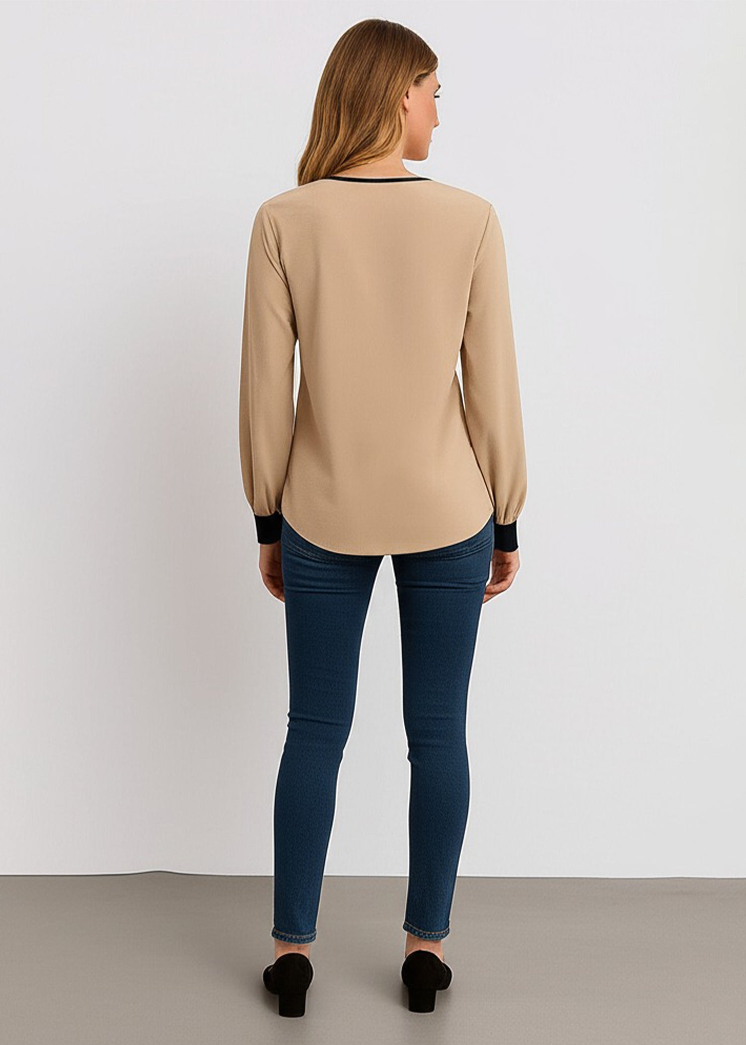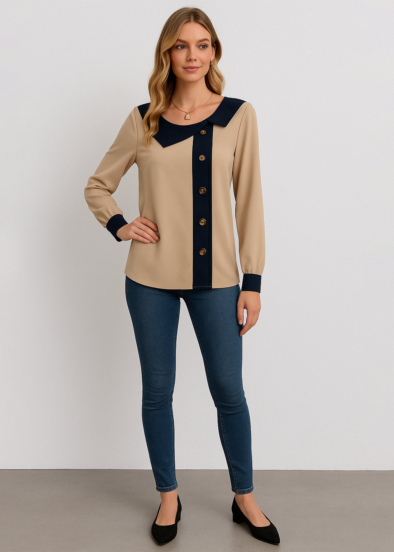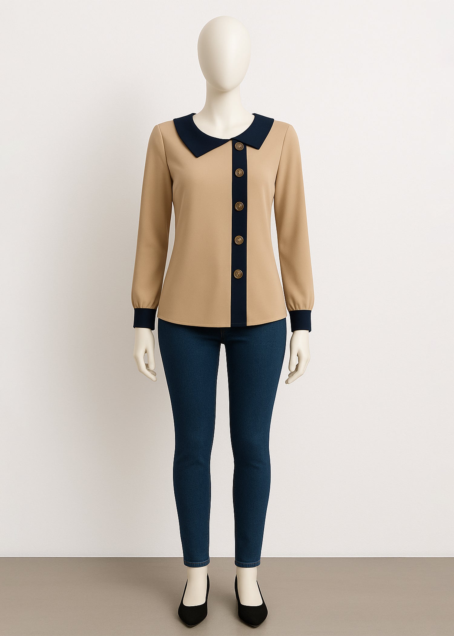 A stylish and comfy dark beige with navy sailor collar shirt with golden toned buttons—perfect for work or casual outings.