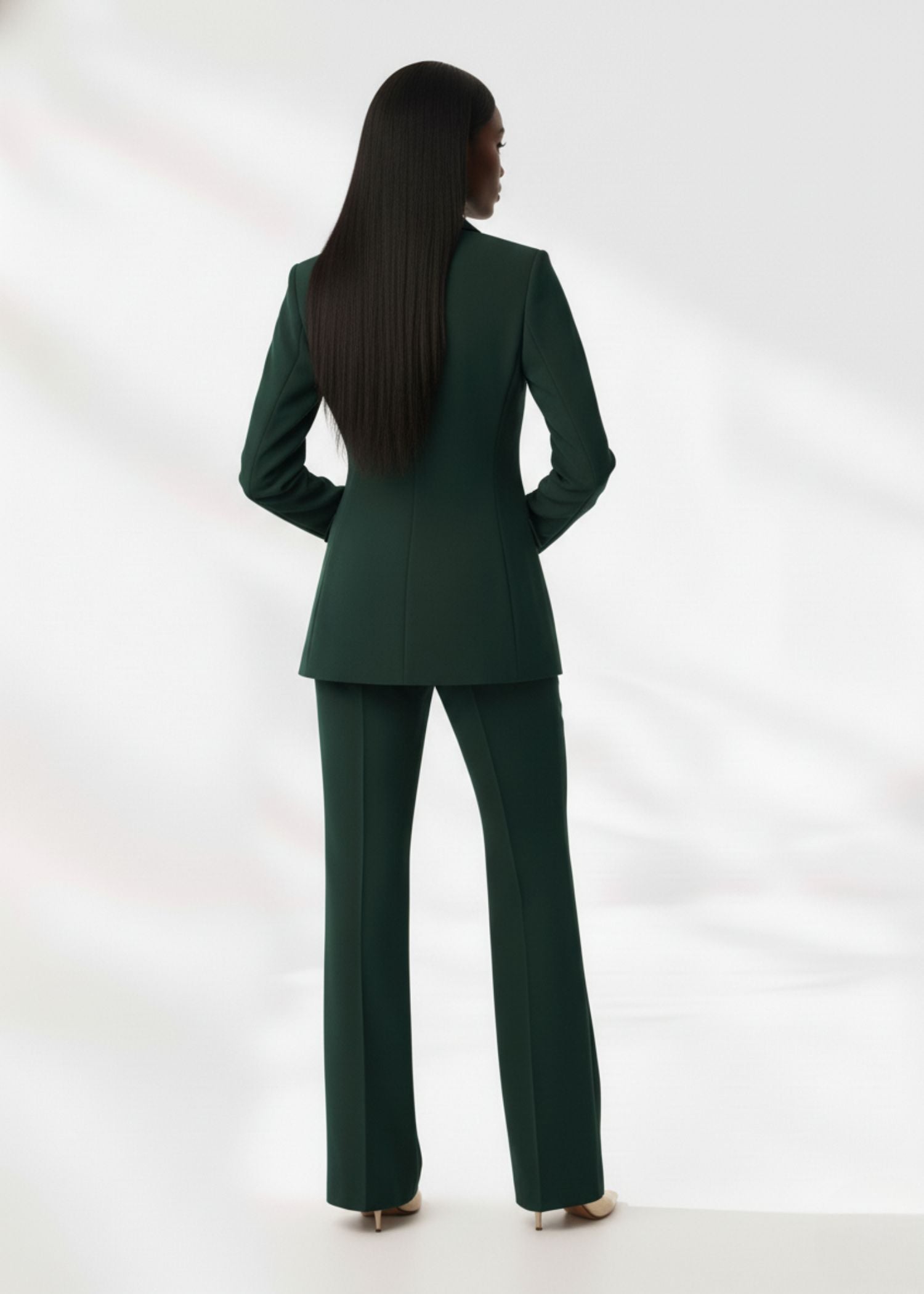 The straight leg trousers complete the blazer with a calm, structured line that feels steady and refined.