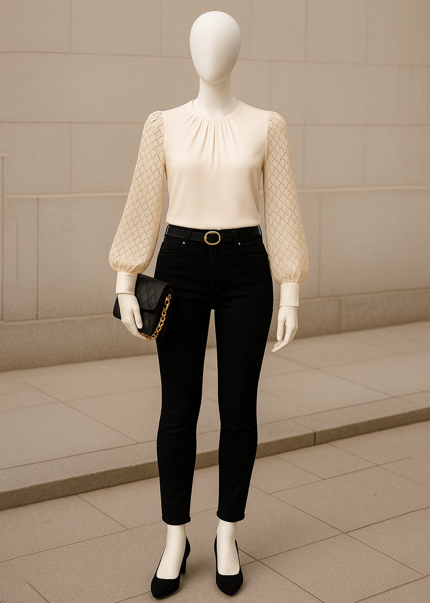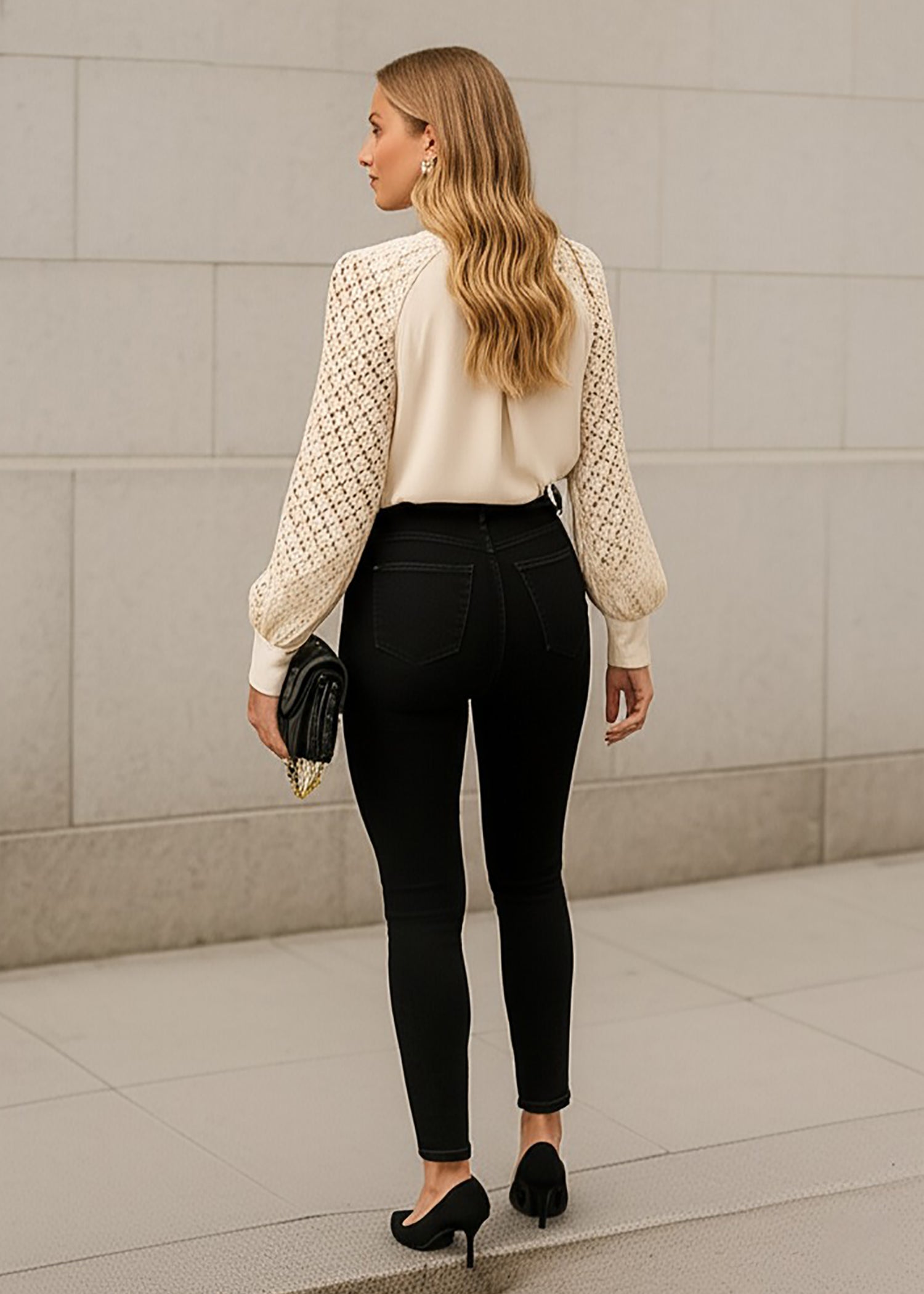 Desk-to-dinner polish, weekend ease. This buttercream blouse blends fluid satin with airy lace sleeves, so you look poised and feel un-restricted.