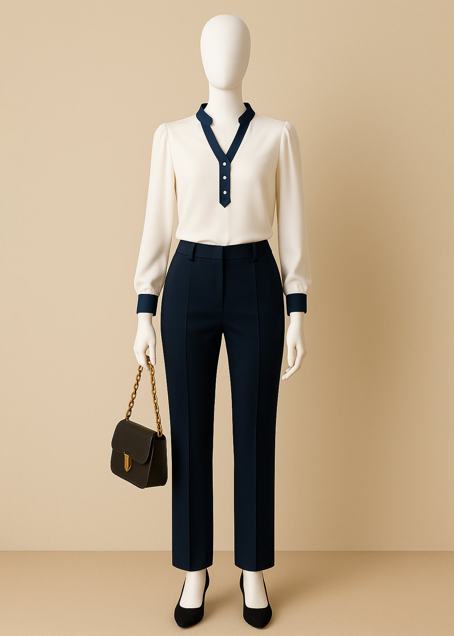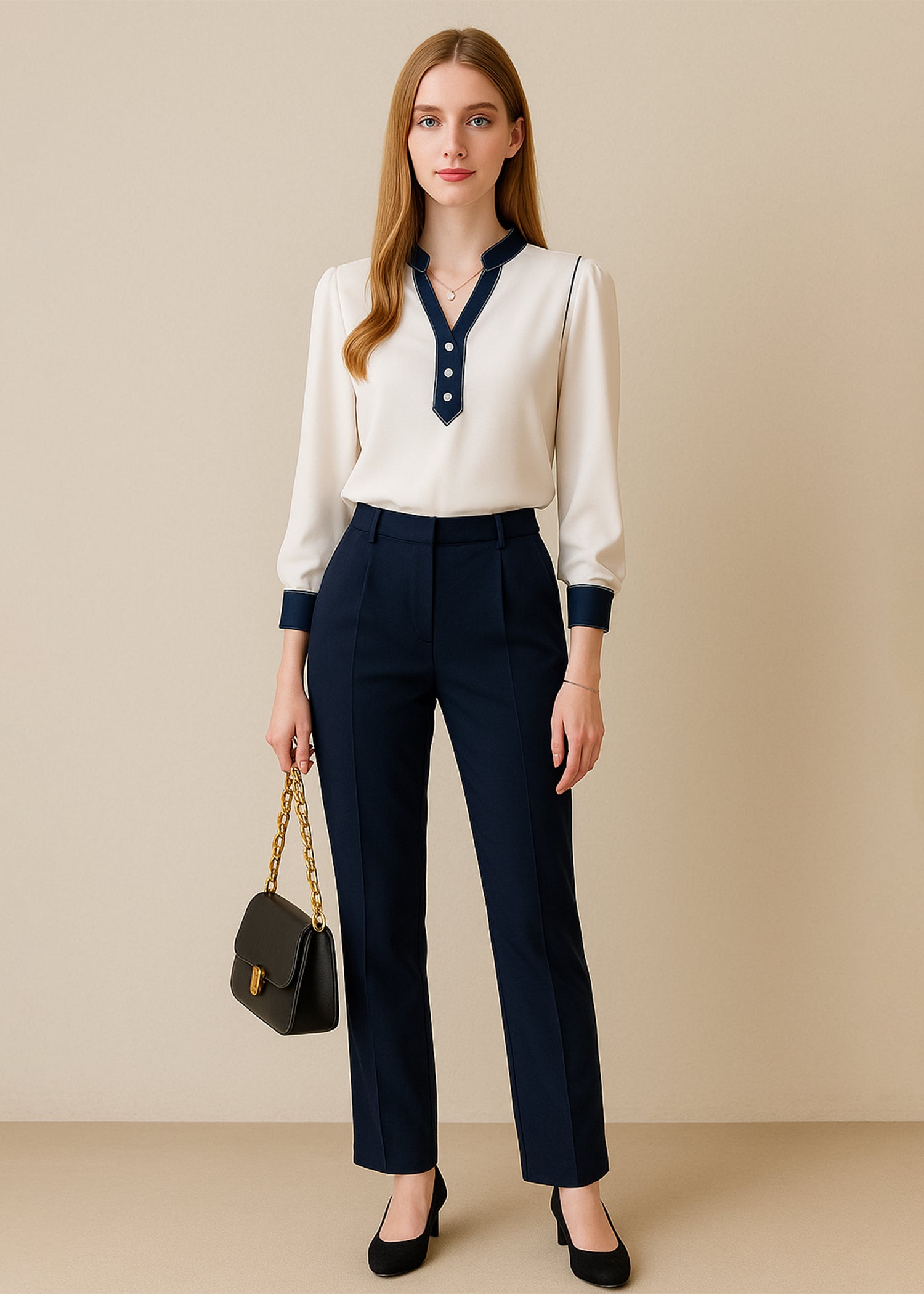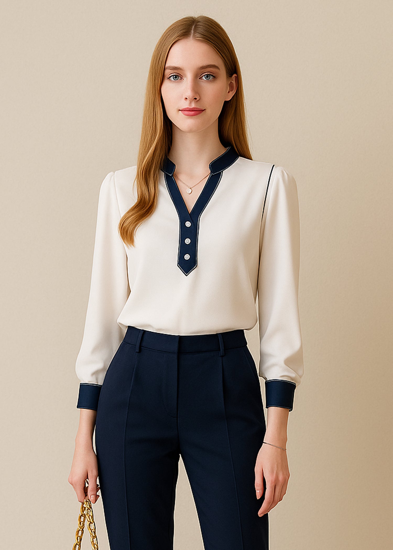 Infuse your everyday elegance with this Off-White Split Neck Top for Women that strikes a perfect balance of styling. The contrasting trim outlining the neckline, placket, and cuff of the blouse adds a classy pop of detail to a classic look. The three-button placket makes the top look polished, while the split neck gives it an elegant touch of femininity. The top is slightly relaxed, but offers a balance of comfort and style that is so important; especially for the office chic, or casual refined style. Please visit our website ARNO by Anny for more blouse.