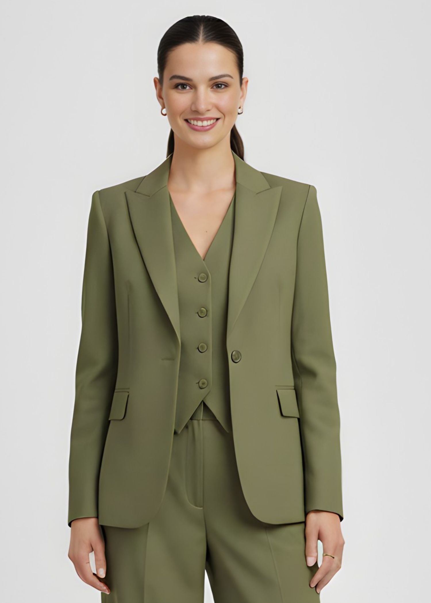 The moss green suit for ladies is combined with high waisted trouser, which are cut in a straight, relaxed leg providing comfort all day long. It is made of a mixture of polyester, rayon, and spandex, giving the fabric a smooth, structured feeling but at the same time, being breathable. It is a designer piece from Arno by anny, and the suit can be worn for long hours without sacrificing comfort since it provides the ease and durability along with a refined finish for formal and professional settings.