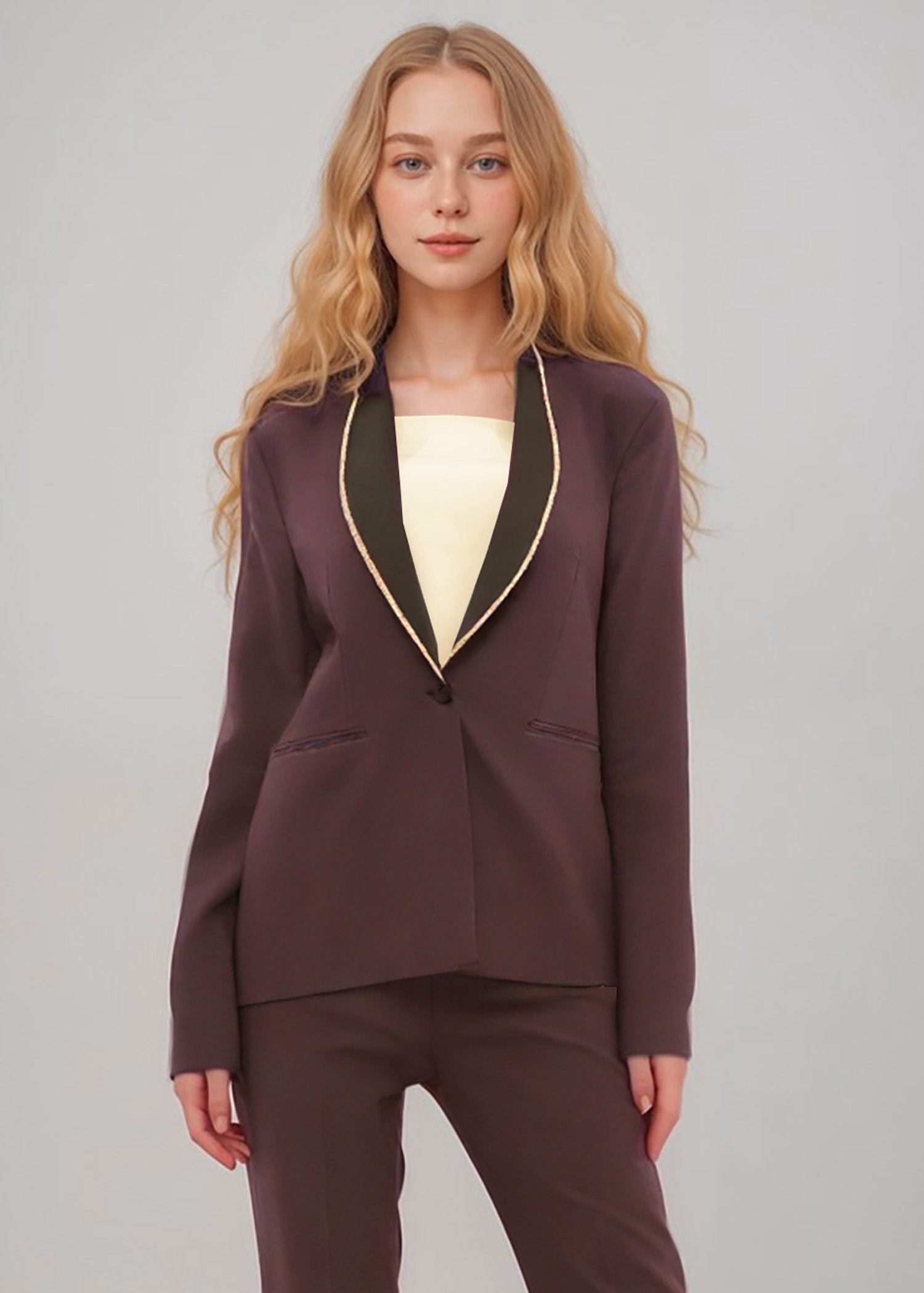 This premium two-piece tuxedo for women is designed for those who appreciate both style and comfort. It feels as good as it looks. The color of this tuxedo is English walnut. The jacket has a sharp single-button closure with satin shawl lapel, straight long sleeves, dual side pockets on the front of the jacket, and slim leg shape pants for a professional and formal look.