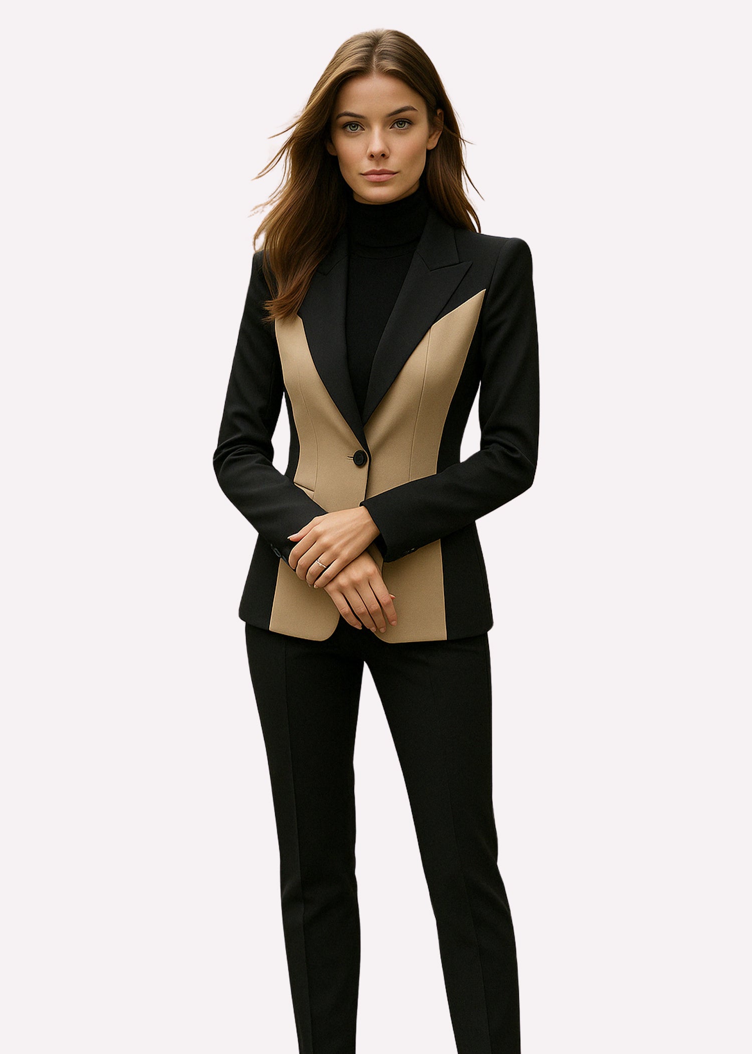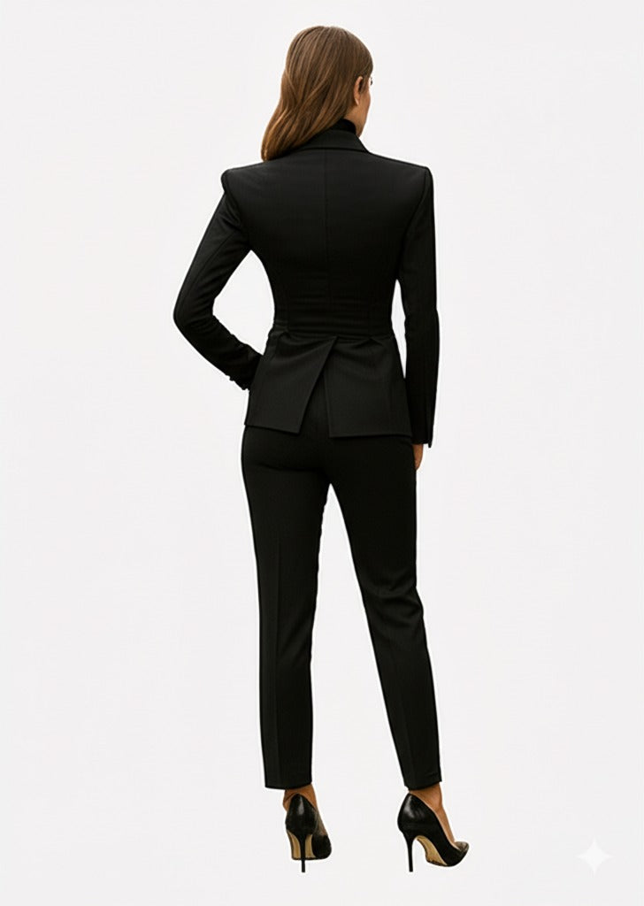 The Women Peak Lapel Tuxedo features a well-fitted blazer paired with sleek, straight black trousers. It presents a bold and sharp look.